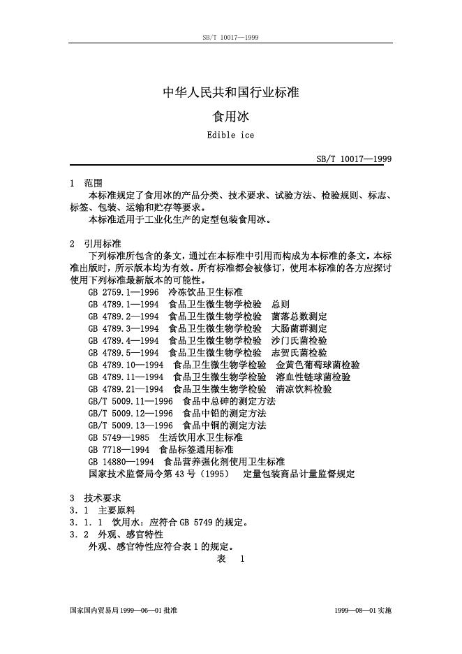 SB/T 10017-1992 食用冰