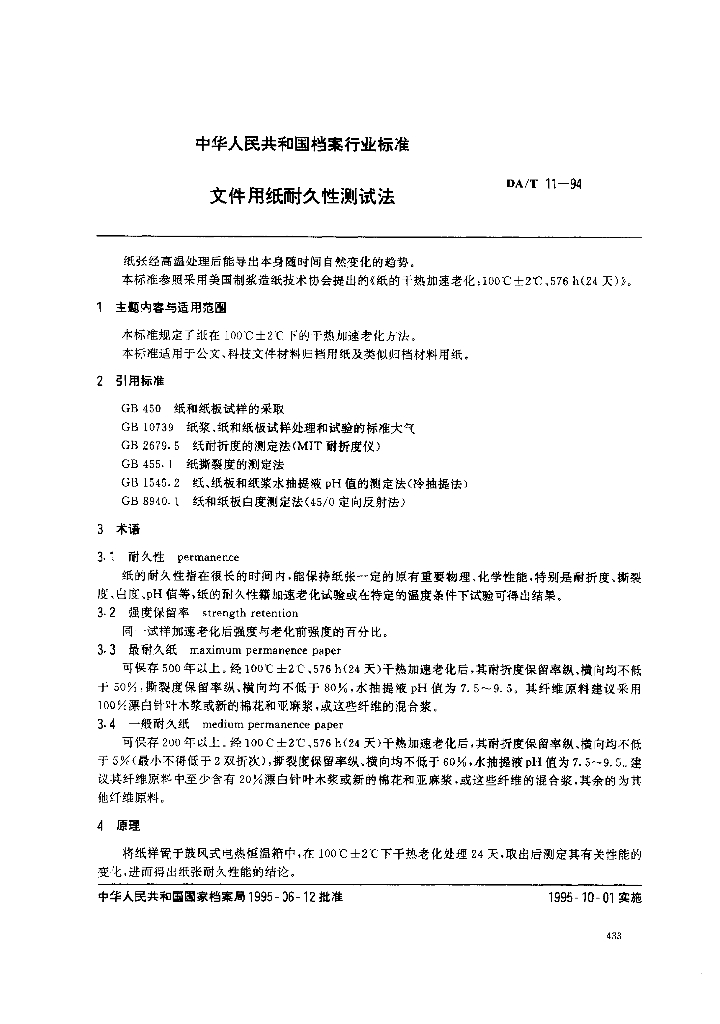 DA/T 11-1994 文件用纸耐久性测试法