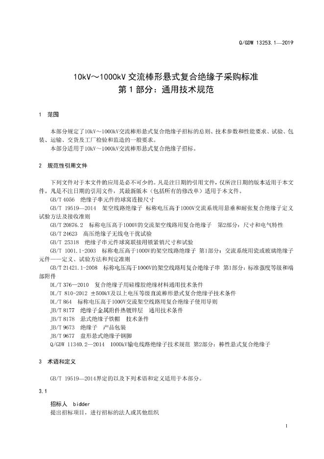 Q/GDW 13253.1-2019 10kV~1000kV交流棒形悬式复合绝缘子采购标准 第1部分:通用技术规范