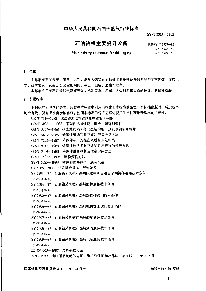 SY/T 5527-2001 石油钻机主要提升设备