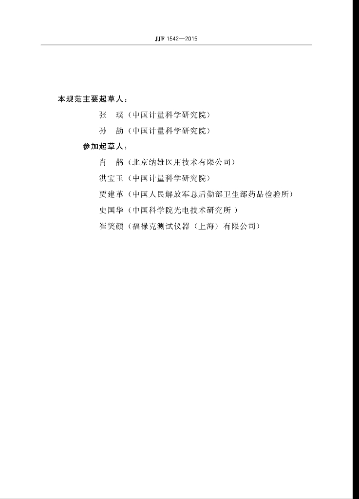 张璞(中国计量科学研究院)、孙劼(中国计量科学研究院)、肖鹊(北京纳雄医用技术有限公司)、洪宝玉(中国计量科学研究院)、贾建革(中国人民解放军总后勤部卫生部药品检验所)、史国华(中国科学院光电技术研究所)、崔笑颜(福禄克测试仪器(上海)有限公司)