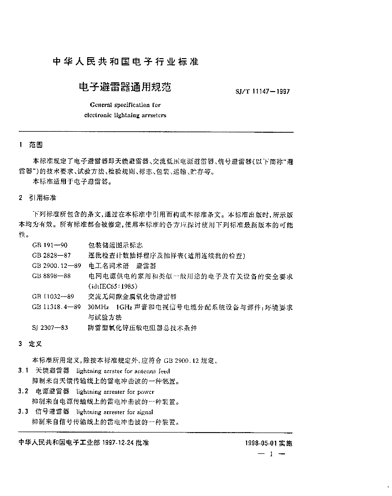 SJ/T 11147-1997 电子避雷器通用规范