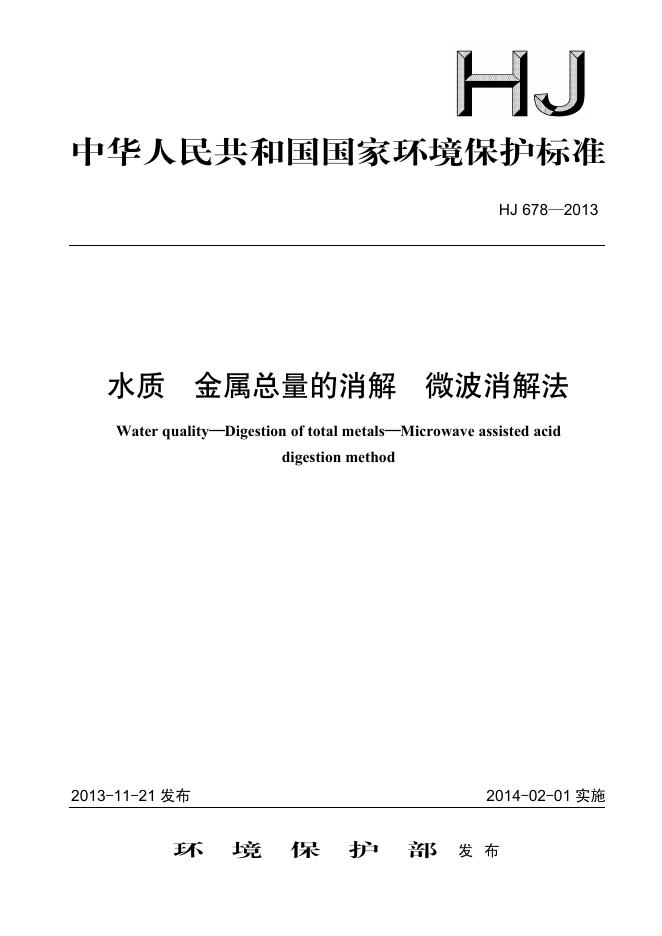 HJ 678-2013 水质 金属总量的消解 微波消解法