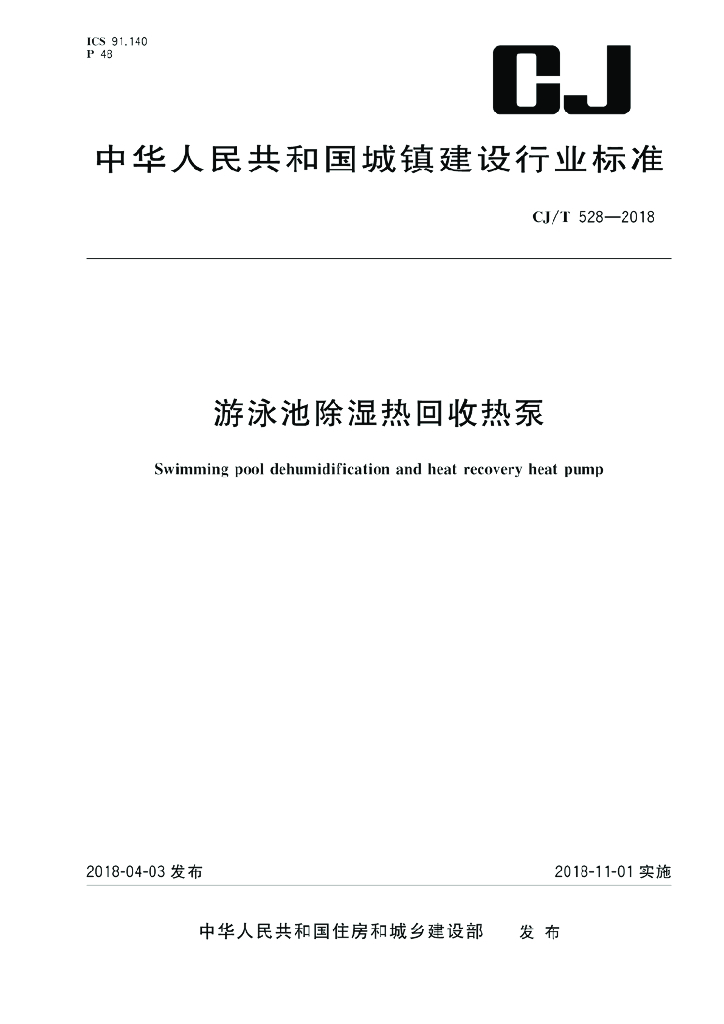 CJ/T 528-2018 游泳池除湿热回收热泵