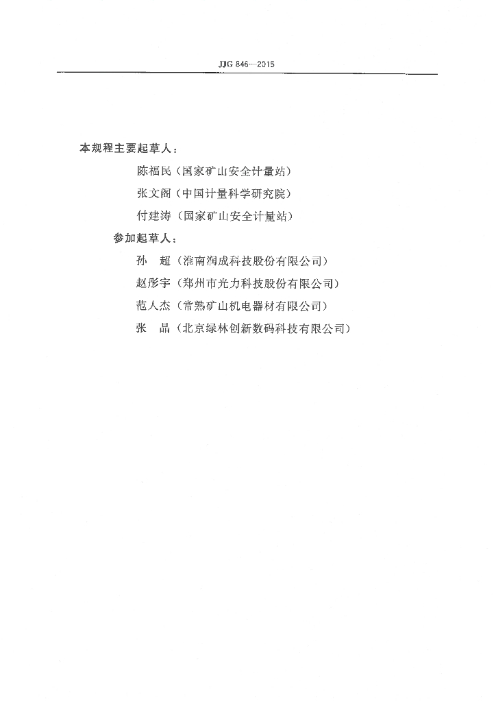 陈福民(国家矿山安全计量站)、张文阁(中国计量科学研究院)、付建涛(国家矿山安全计量站)、孙超(淮南润成科技股份有限公司)、赵彤宇(郑州市光力科技股份有限公司)、范人杰(常熟矿山机电器材有限公司)、张晶(北京绿林创新数码科技有限公司)