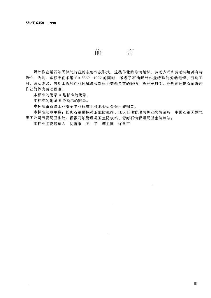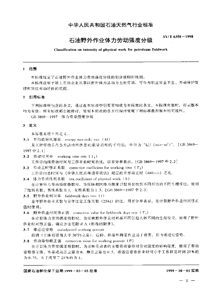 SY/T 6358-1998 石油野外作业体力劳动强度分级