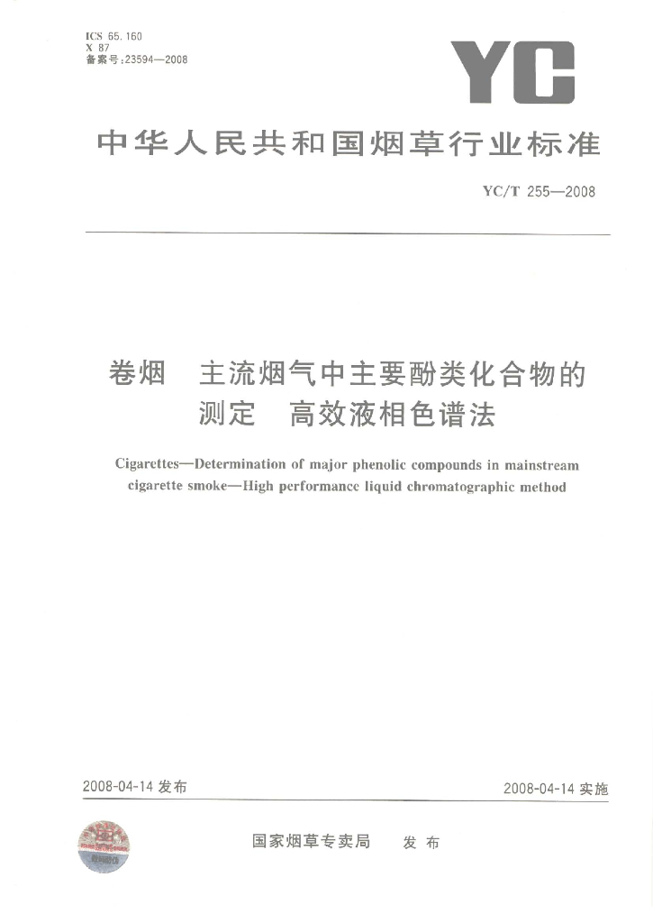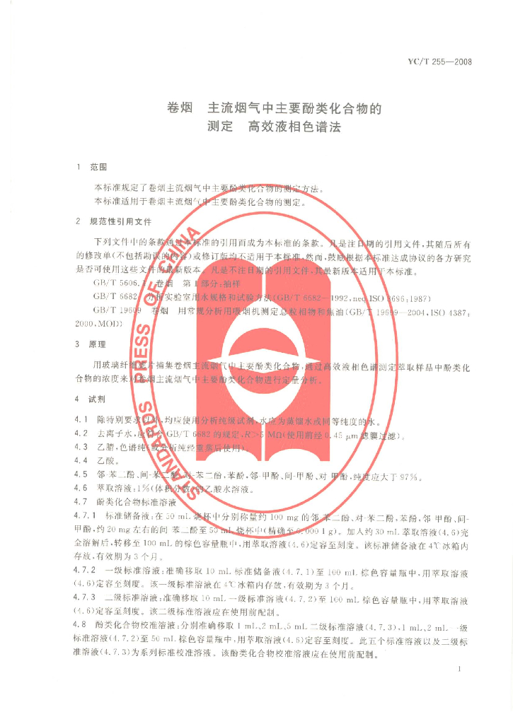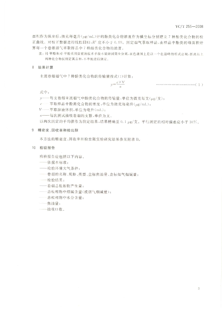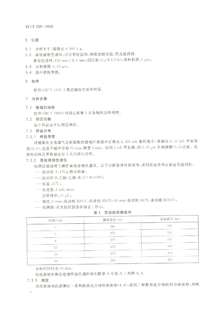 YC/T 255-2008 卷烟主流烟气中主要酚类化合物的测定 高效液相色谱法