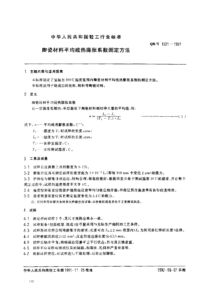 QB/T 1321-1991 陶瓷材料平均线热膨胀系数测定方法