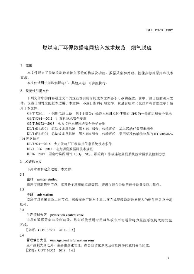 DL/T 2370-2021 燃煤电厂环保数据电网接入技术规范 烟气脱硫