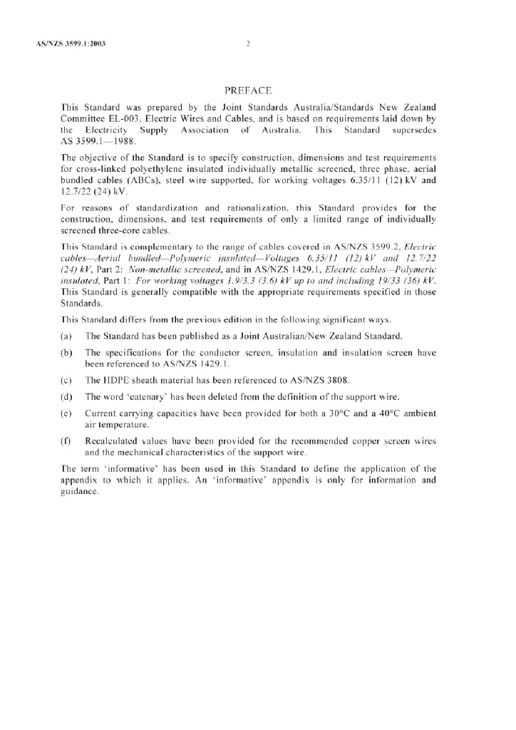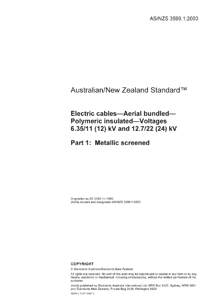 AS/NZS 3599.1:2003 工作电压6.35/11(12)kV及12.7/22(24)kV聚合物绝缘架空集束电缆 第1部分:金属屏蔽