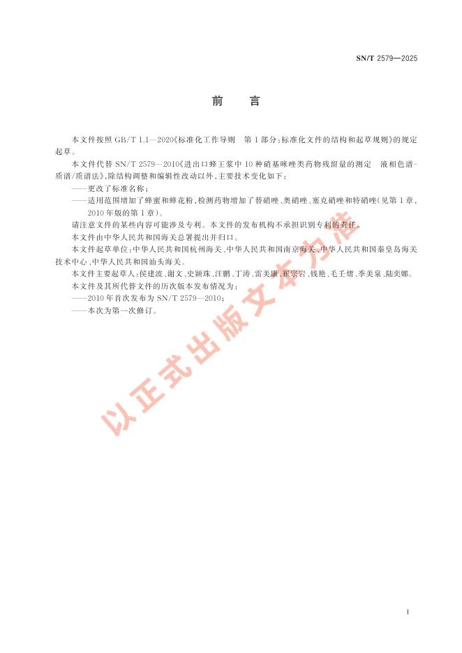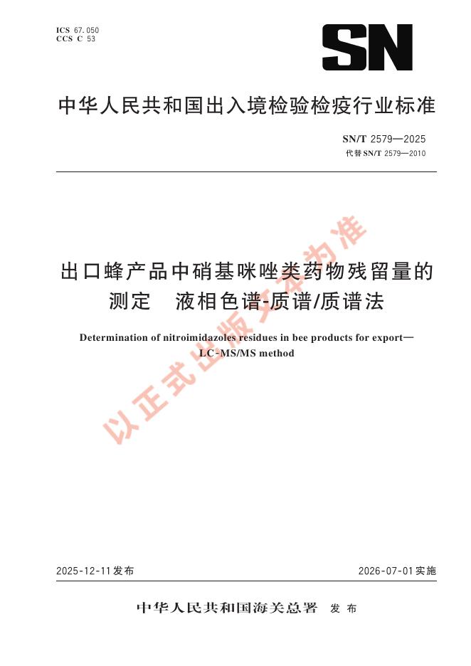 SN/T 2579-2025 出口蜂产品中硝基咪唑类药物残留量的测定 液相色谱-质谱/质谱法