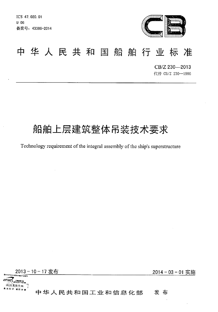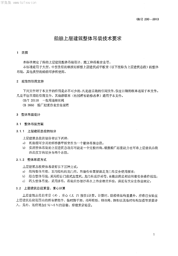 CB/Z 230-2013 船舶上层建筑整体吊装技术要求