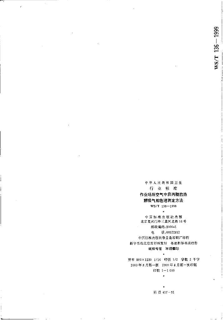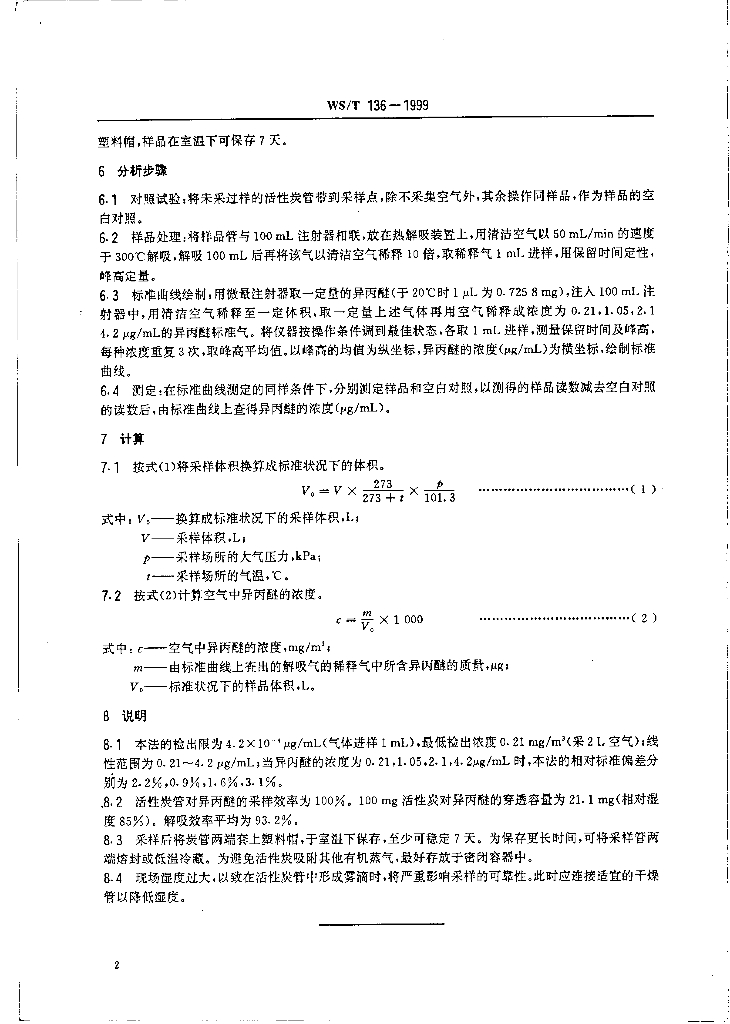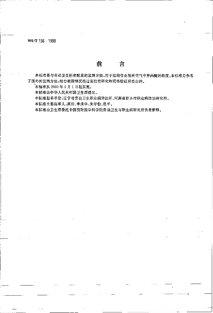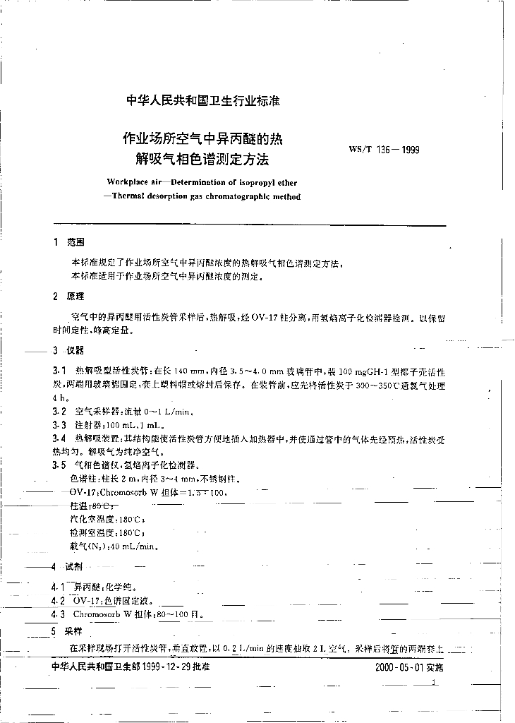 WS/T 136-1999 作业场所空气中异丙醚的热解吸气相色谱测定方法