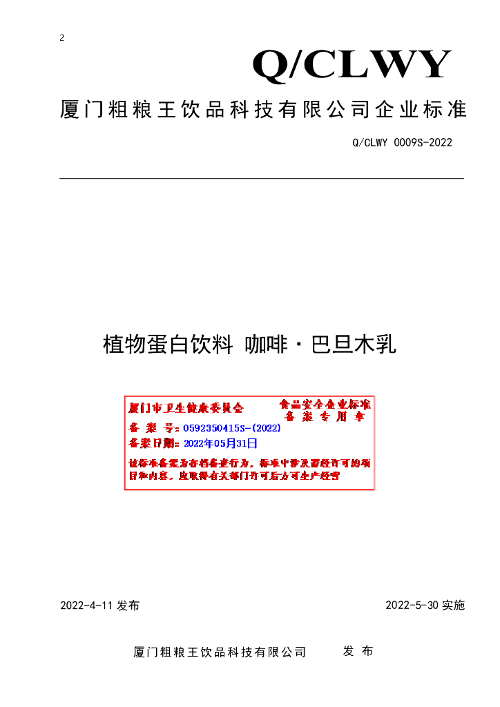 Q/CLWY 0009S-2022 植物蛋白饮料 咖啡・巴旦木乳