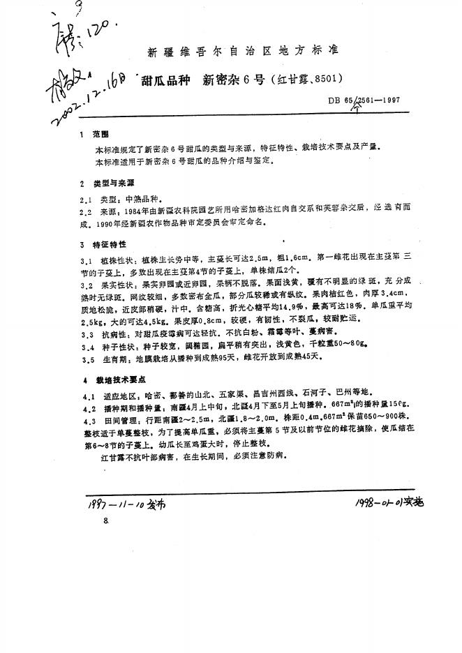 DB65/T 2561-1997 甜瓜品种 新密杂6号