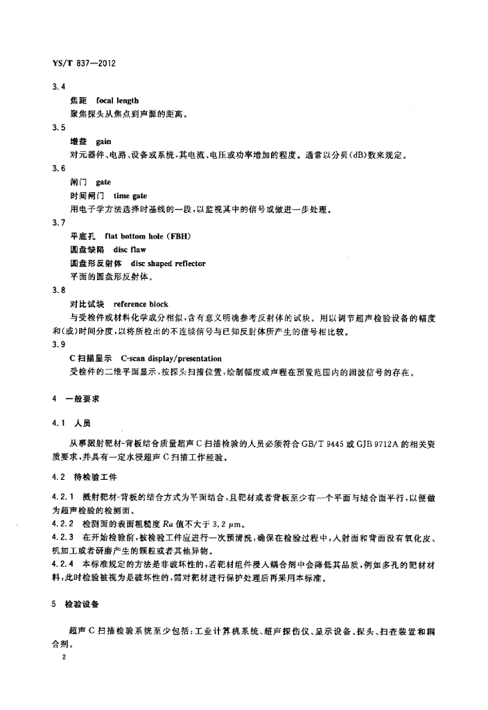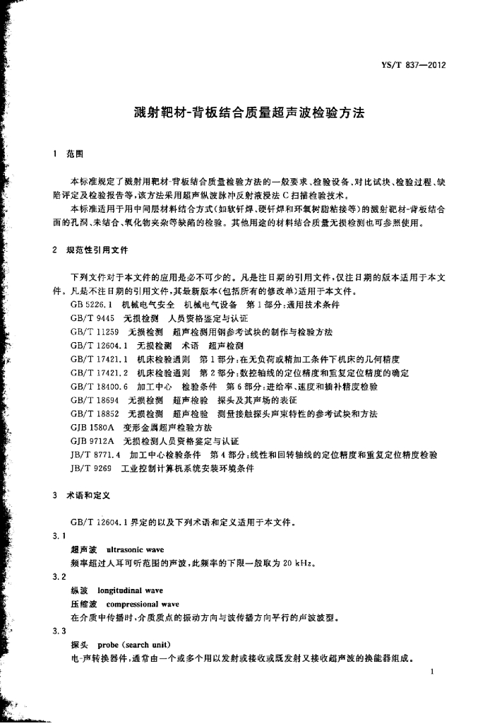YS/T 837-2012 溅射靶材-背板结合质量超声波检验方法