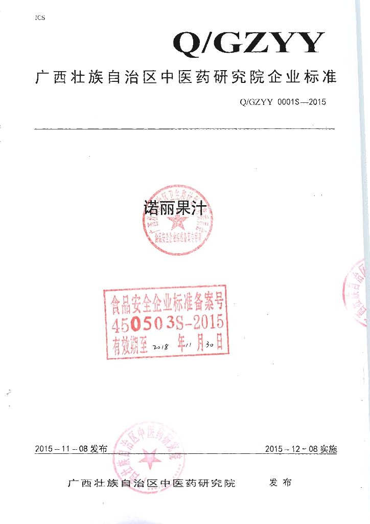Q/GZYY 0001S-2015 广西壮族自治区中医药研究院 诺丽果汁