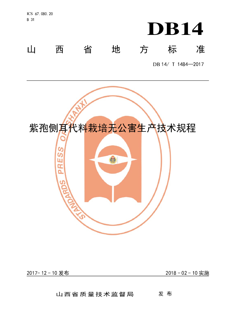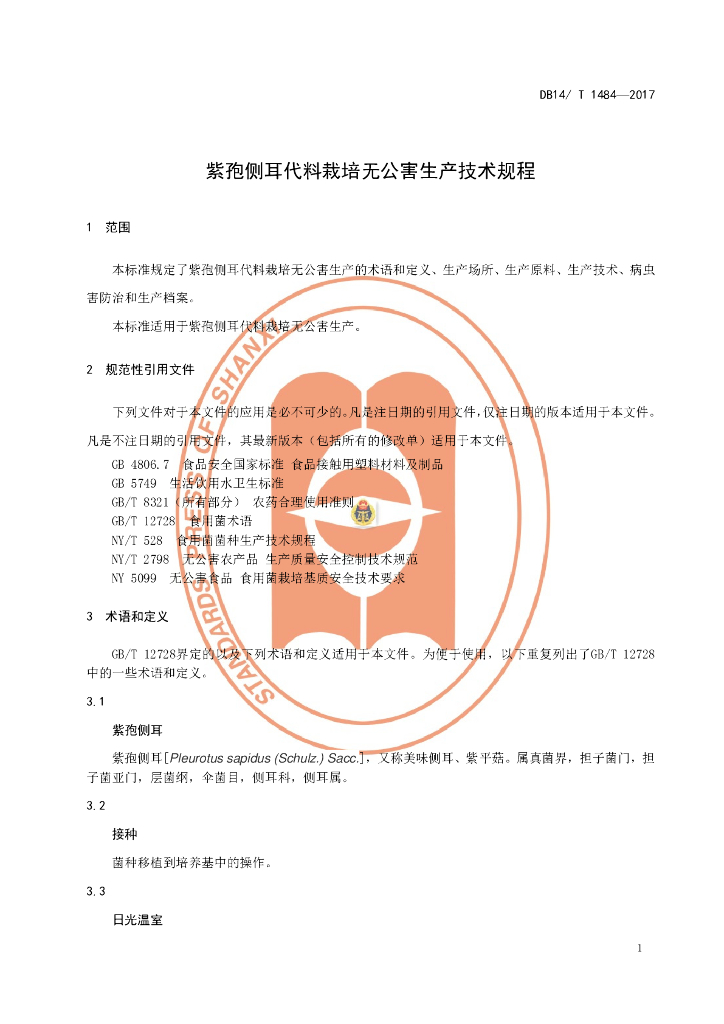 DB14/T 1484-2017 紫孢侧耳代料栽培无公害生产技术规程