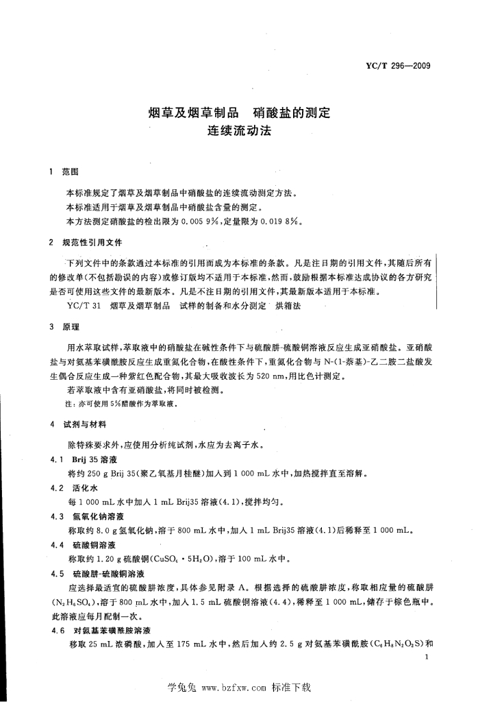 YC/T 296-2009 烟草及烟草制品 硝酸盐的测定 连续流动法
