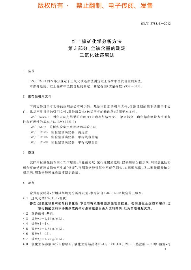 SN/T 2763.3-2012 红土镍矿化学分析方法 第3部分:全铁含量的测定 三氯化钛还原法