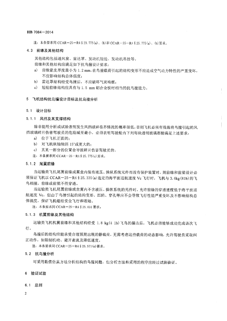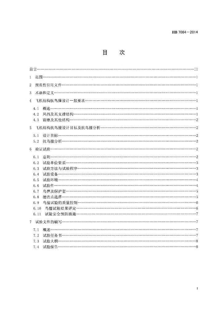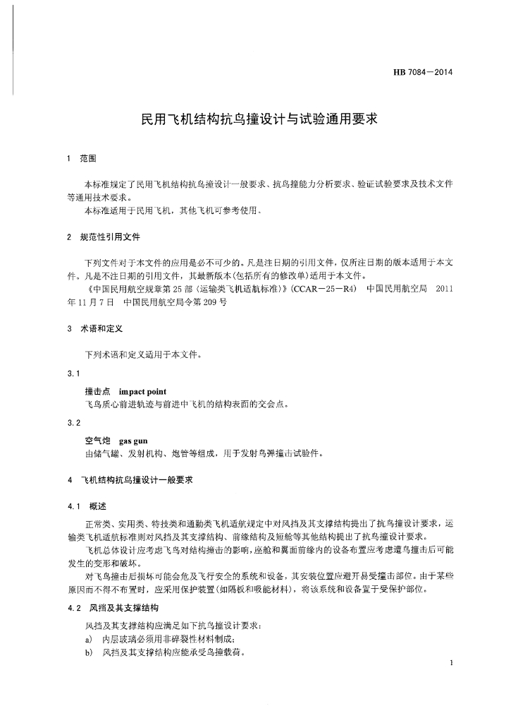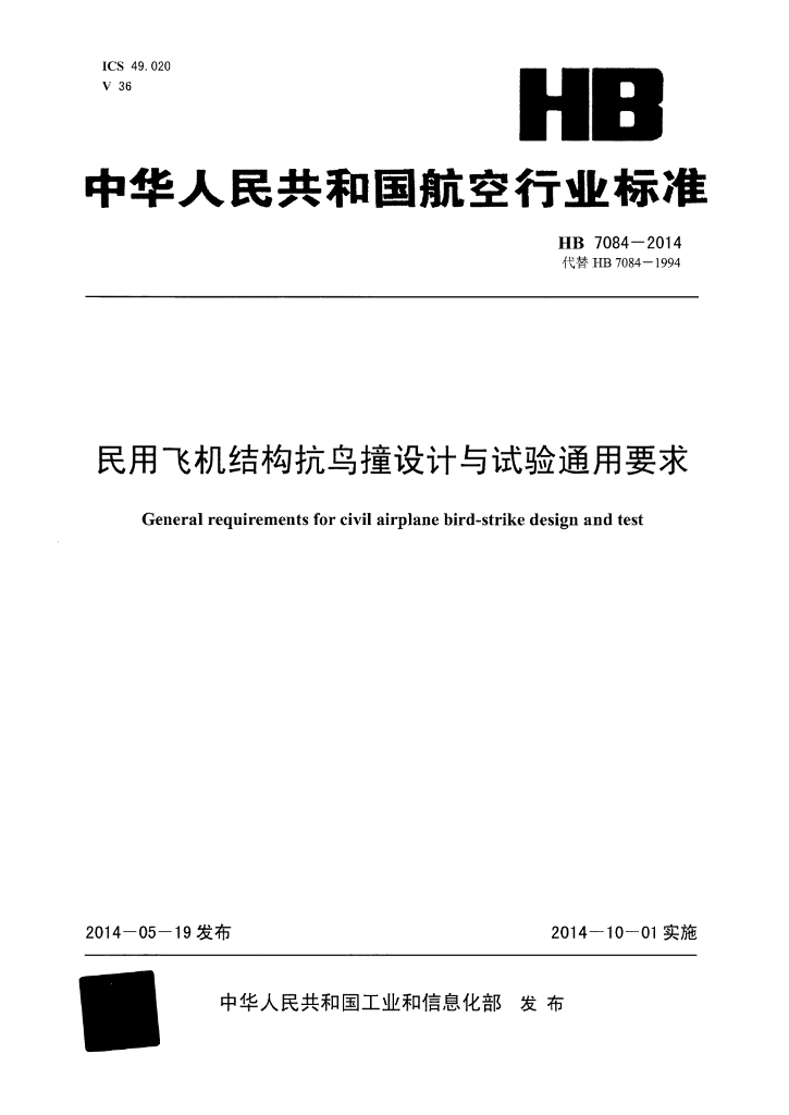 HB 7084-2014 民用飞机结构抗鸟撞设计与试验通用要求