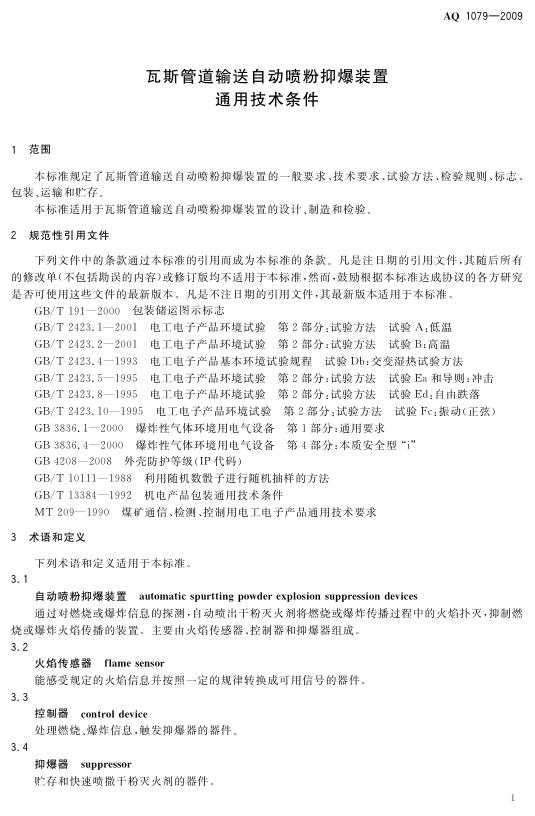 AQ/T 1079-2009 瓦斯管道输送自动喷粉抑爆装置通用技术条件