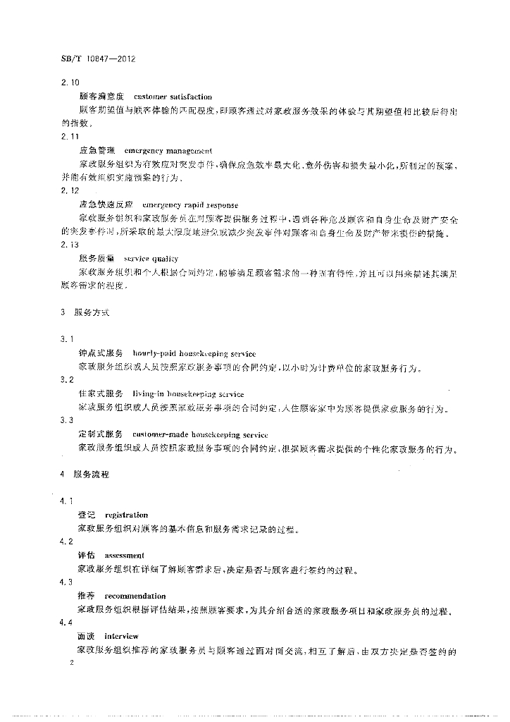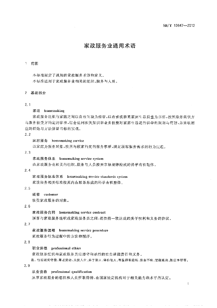 SB/T 10847-2012 家政服务业通用术语
