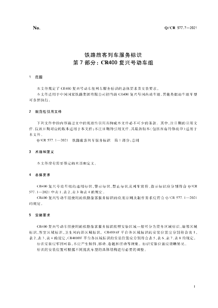 Q/CR 577.7-2021 铁路旅客列车服务标识 第7部分:CR400复兴号动车组