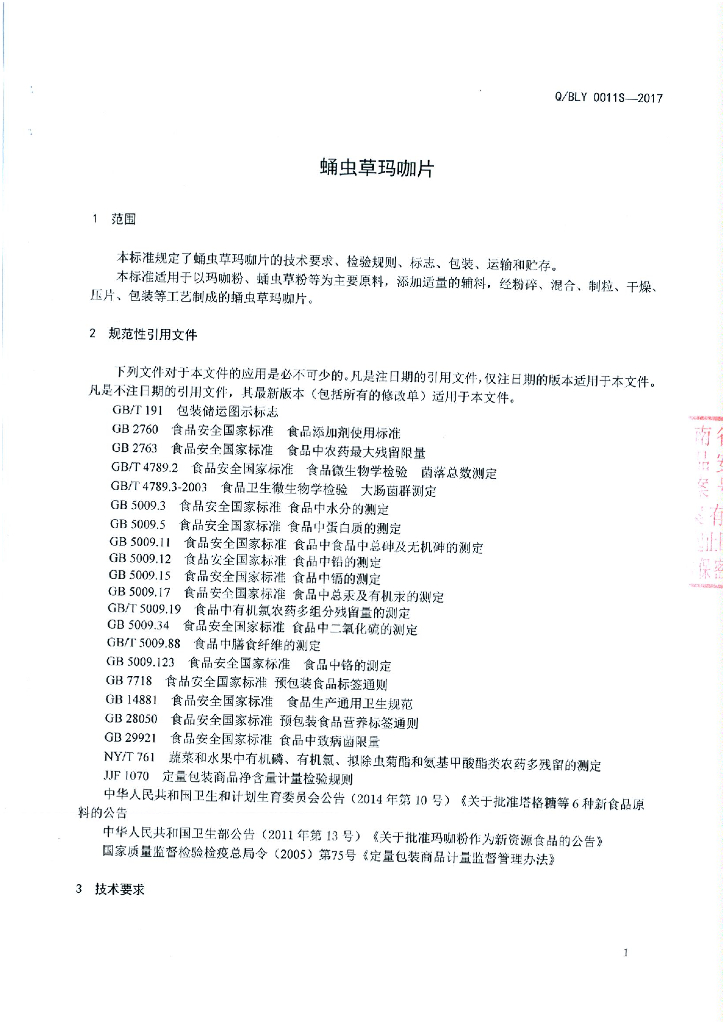 Q/BLY 0011S-2017 蛹虫草玛咖片