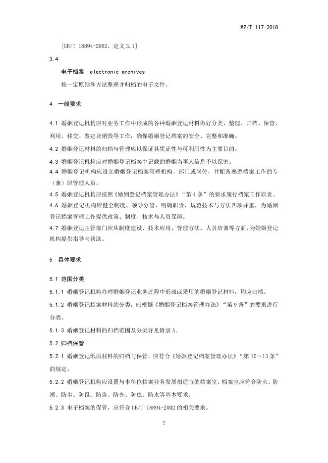 MZ/T 117-2018 婚姻登记档案管理要求
