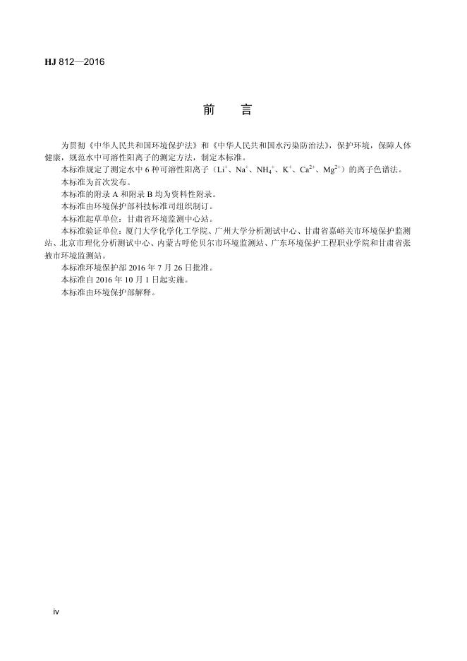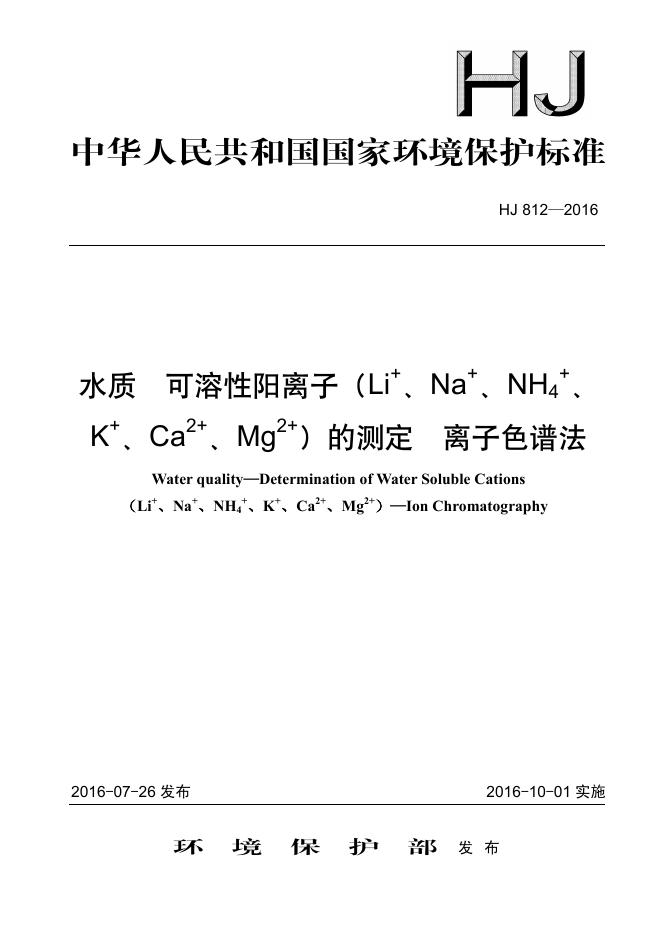 HJ 812-2016 水质 可溶性阳离子(Li+ 、Na+、NH4+、K+、Ca2+、Mg2+)的测定 离子色谱法