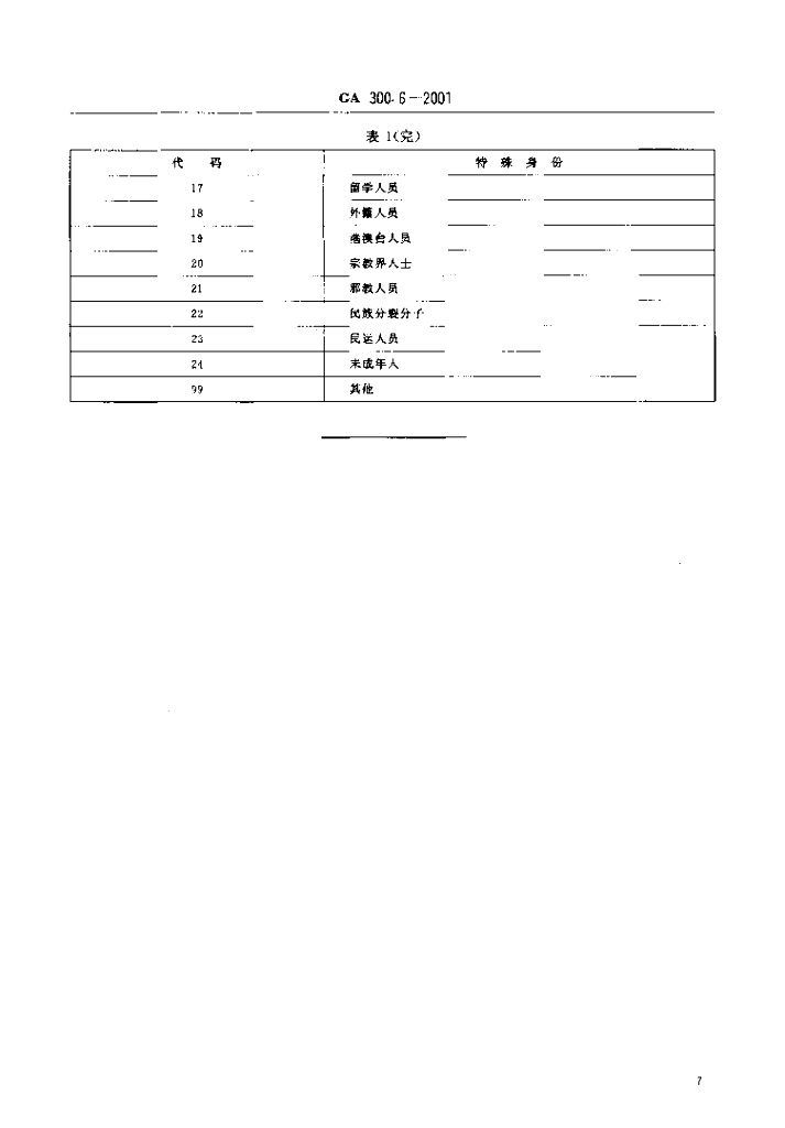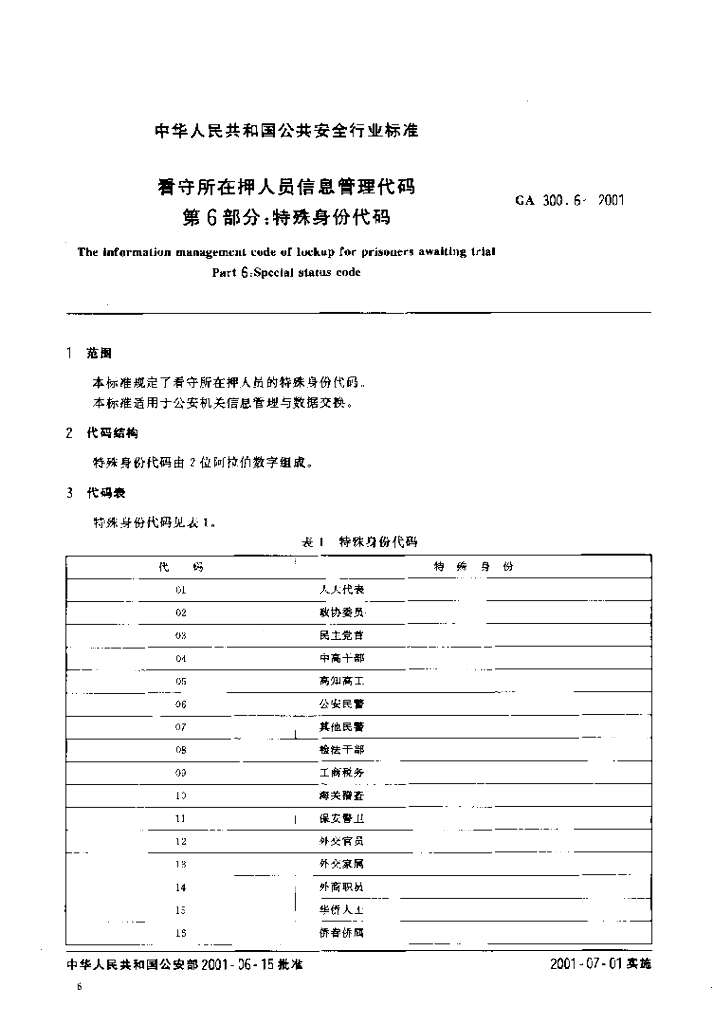 GA 300.6-2001 看守所在押人员信息管理代码 第6部分:特殊身份代码