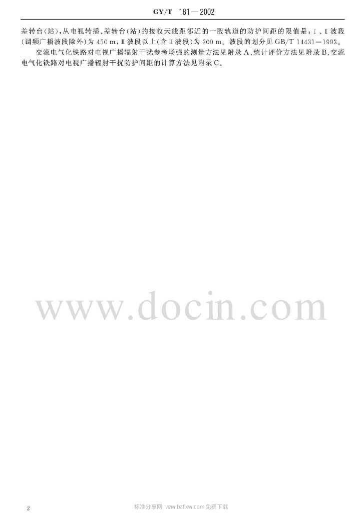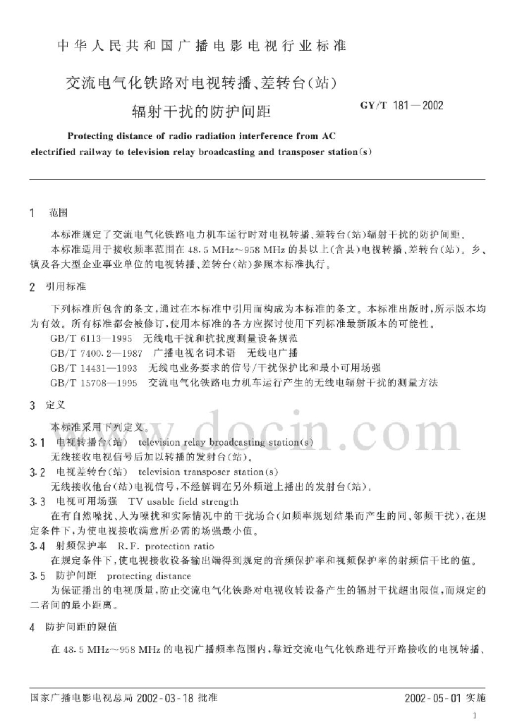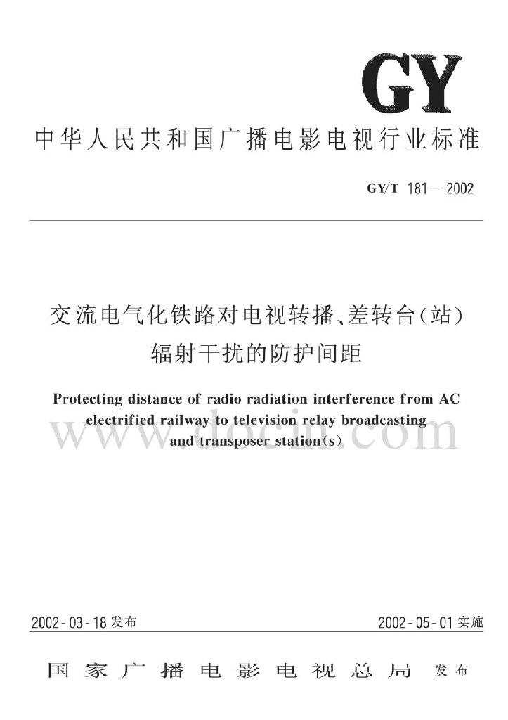 GY/T 181-2002 交流电气化铁路对电视转播、差转台(站)辐射干扰的防护间距