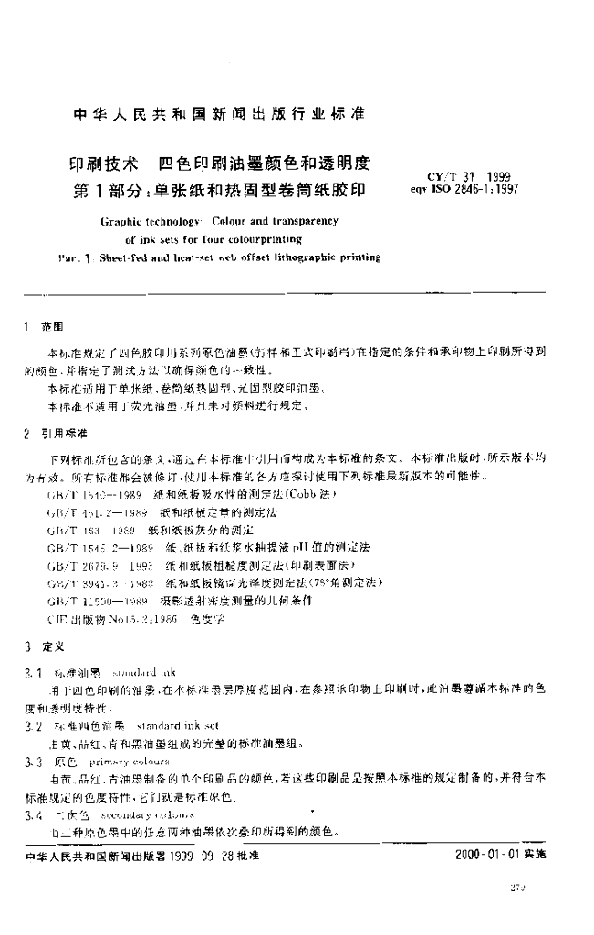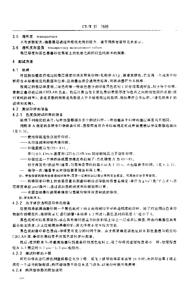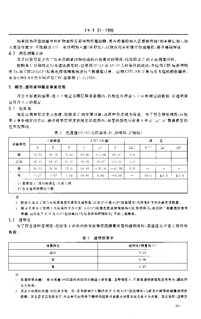CY/T 31-1999 印刷技术 四色印刷油墨颜色和透明度 第1部分:单张纸和热固型卷筒纸胶印