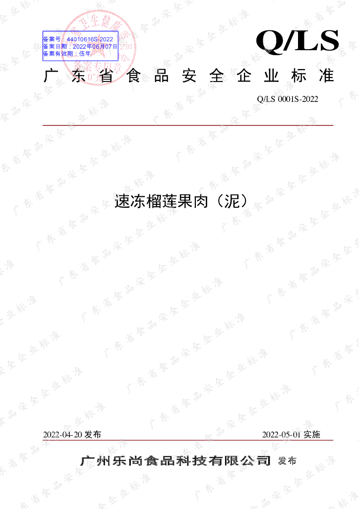 Q/LS 0001S-2022 速冻榴莲果肉(泥)