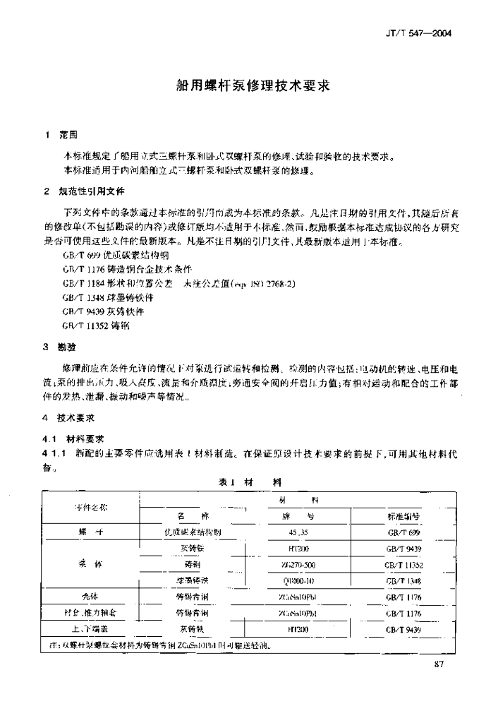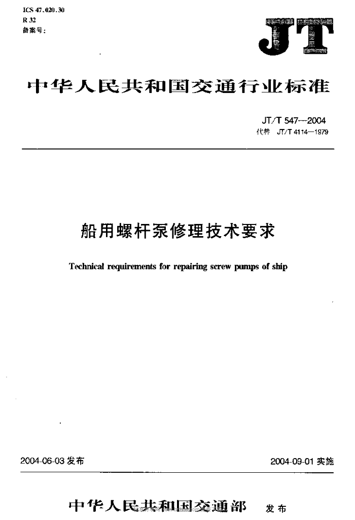 JT/T 547-2004 船用螺杆泵修理技术要求