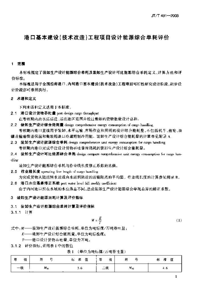 JT/T 491-2003 港口基本建设(技术改造)工程项目设计能源综合单耗评价