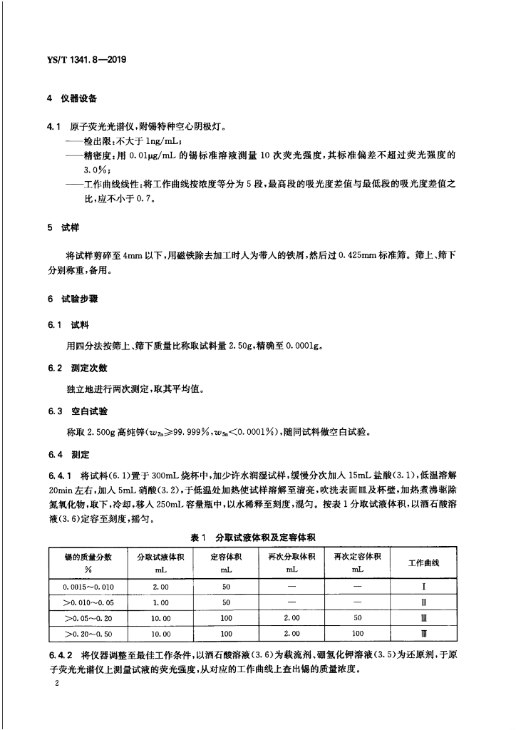 YS/T 1341.8-2019 粗锌化学分析方法 第8部分:锡含量的测定 原子荧光光谱法
