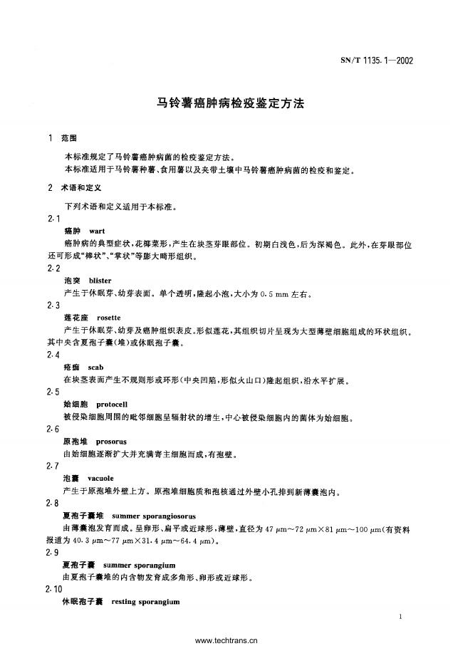 SN/T 1135.1-2002 马铃薯癌肿病检疫鉴定方法
