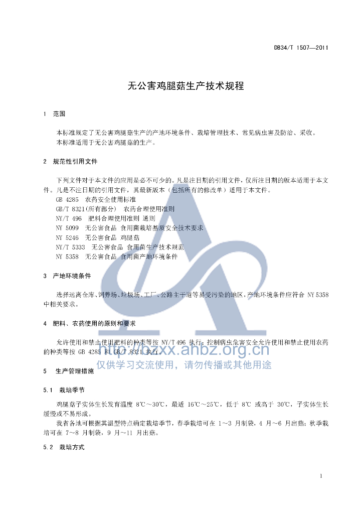 DB34/T 1507-2011 无公害鸡腿菇生产技术规程
