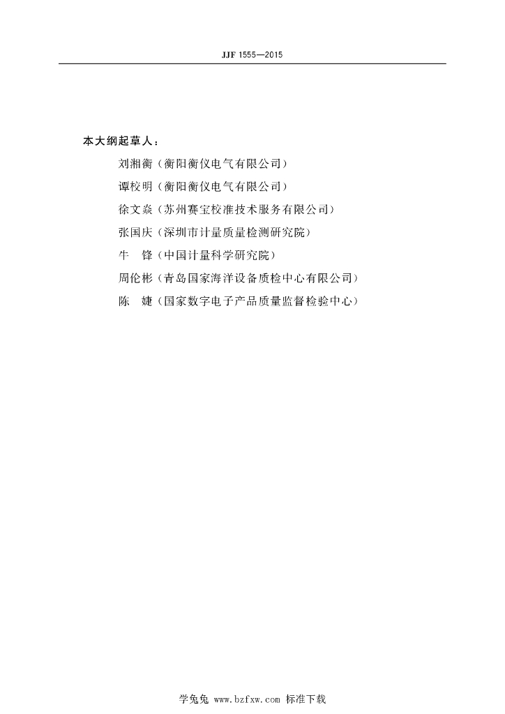 刘湘衡(衡阳衡仪电气有限公司)、谭校明(衡阳衡仪电气有限公司)、徐文焱(苏州赛宝校准技术服务有限公司)、张国庆(深圳市计量质量检测研究院)、牛锋(中国计量科学研究院)、周伦彬(青岛国家海洋设备质检中心有限公司)、陈婕(国家数字电子产品质量监督检验中心)