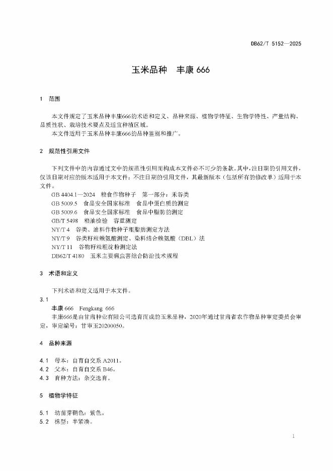 DB62/T 5152-2025 玉米品种 丰康666