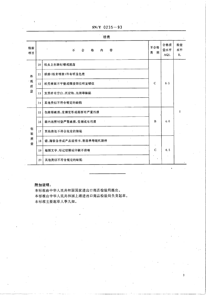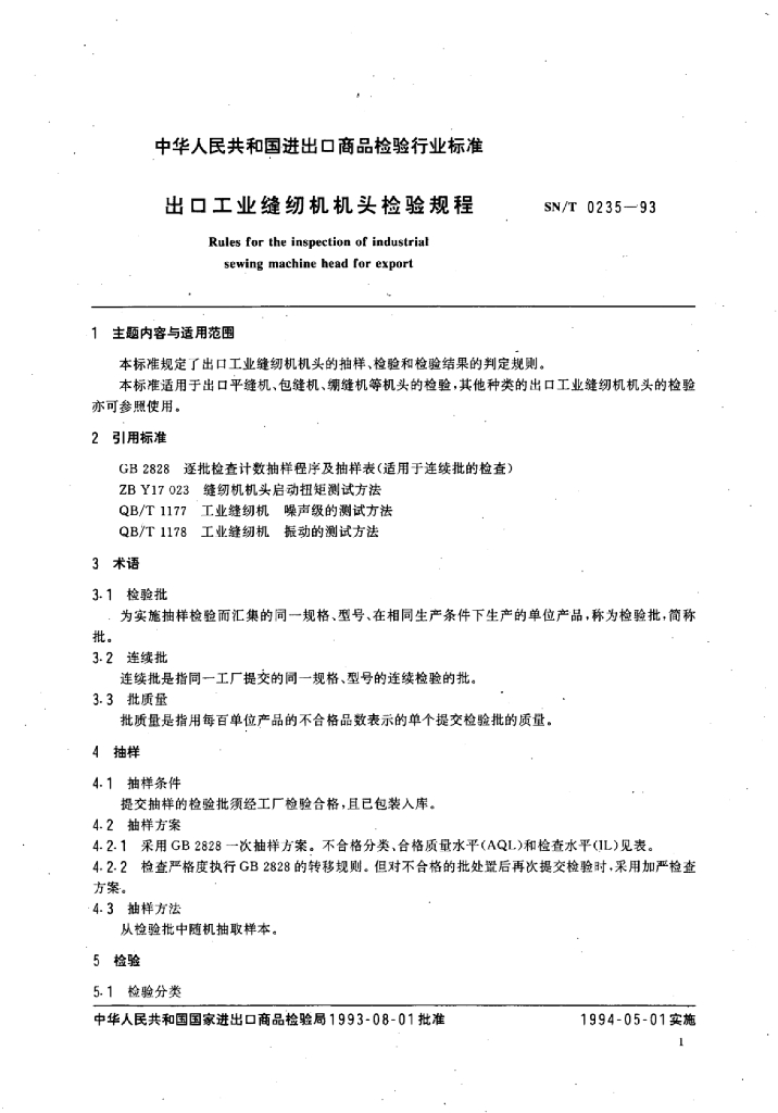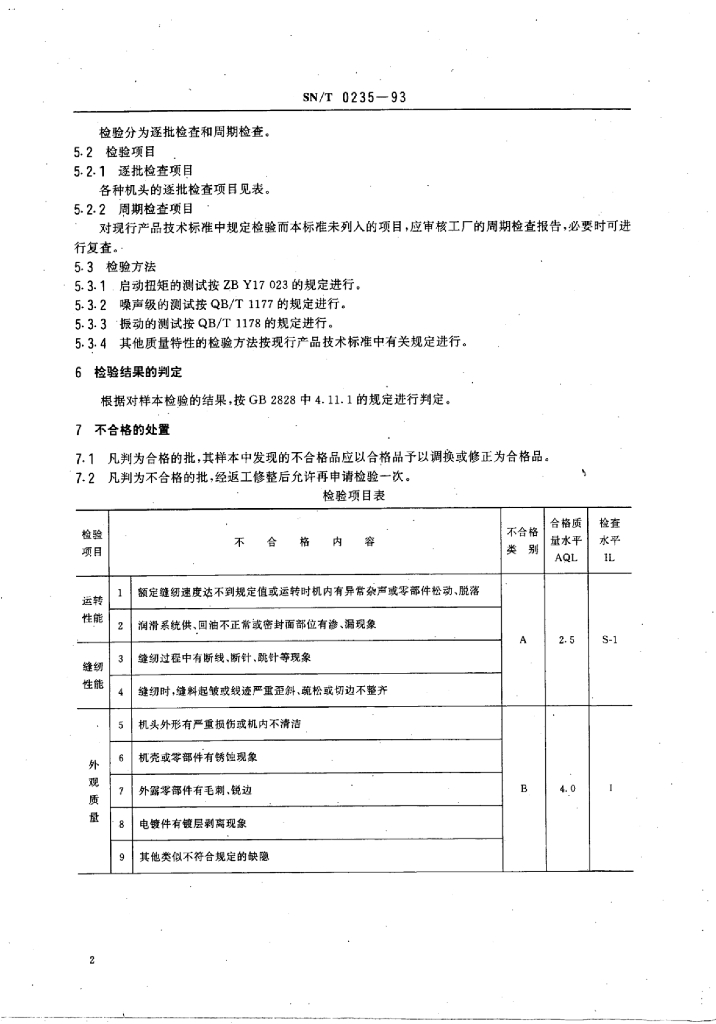 SN/T 0235-1993 出口工业缝纫机机头检验规程
