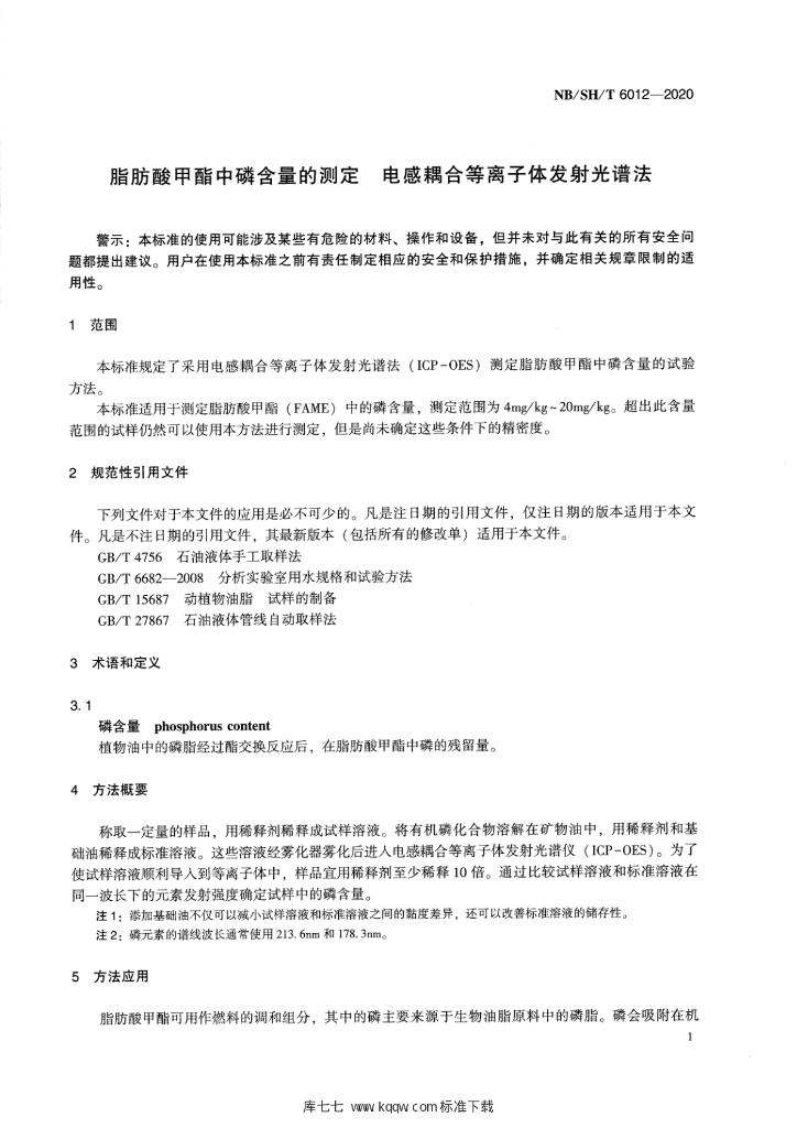 NB/SH/T 6012-2020 脂肪酸甲酯中磷含量的测定 电感耦合等离子体发射光谱法