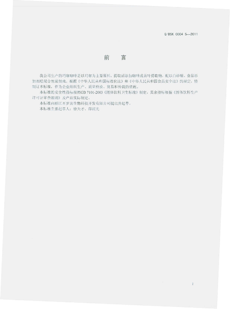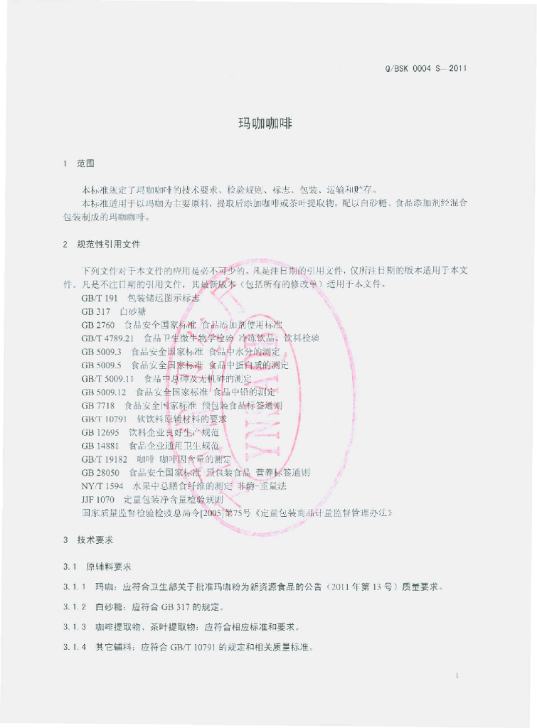 Q/BSK 0004S-2011 玛咖咖啡