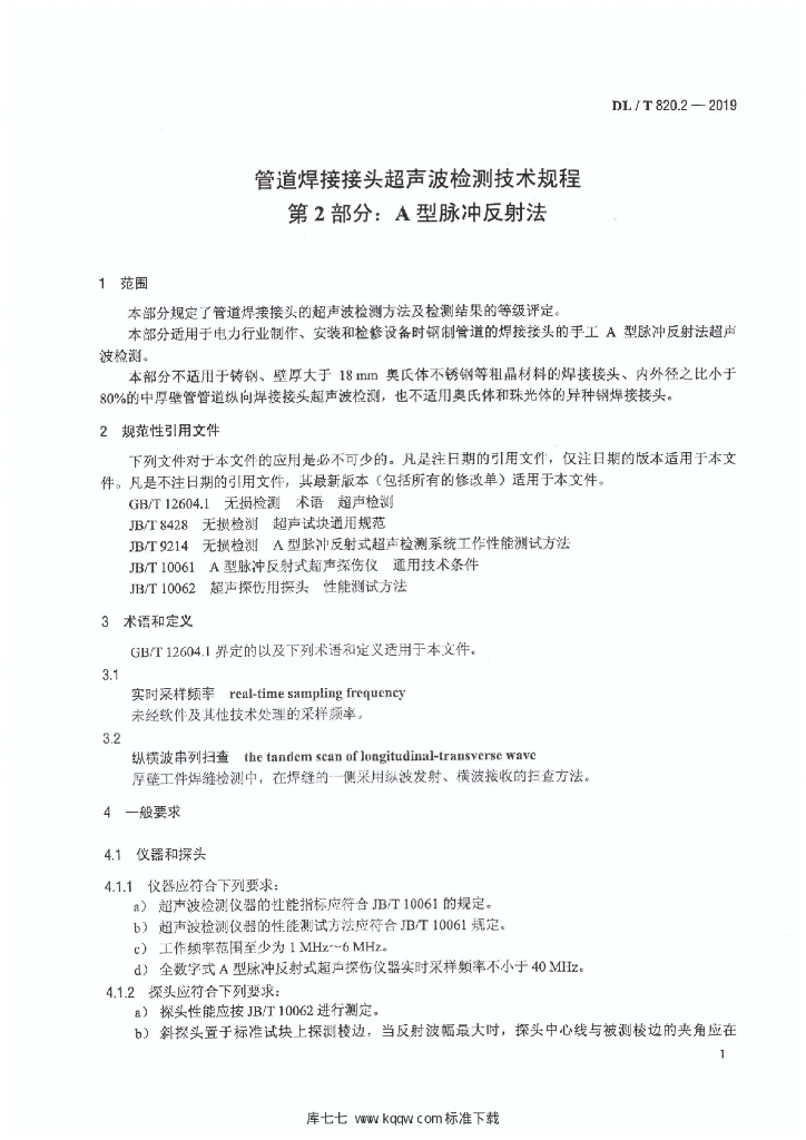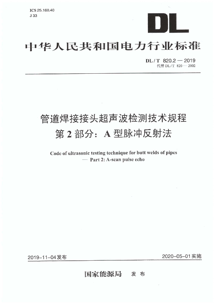 DL/T 820.2-2019 管道焊接接头超声波检测技术规程 第2部分:A型脉冲反射法