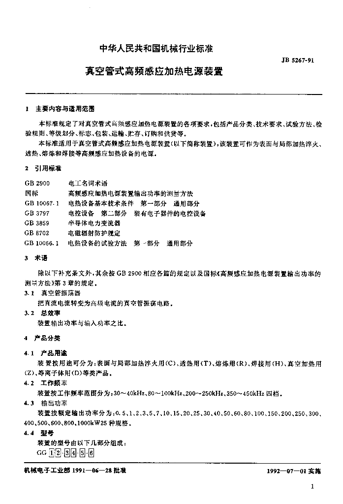JB/T 5267-1991 真空管式高频感应加热电源装置