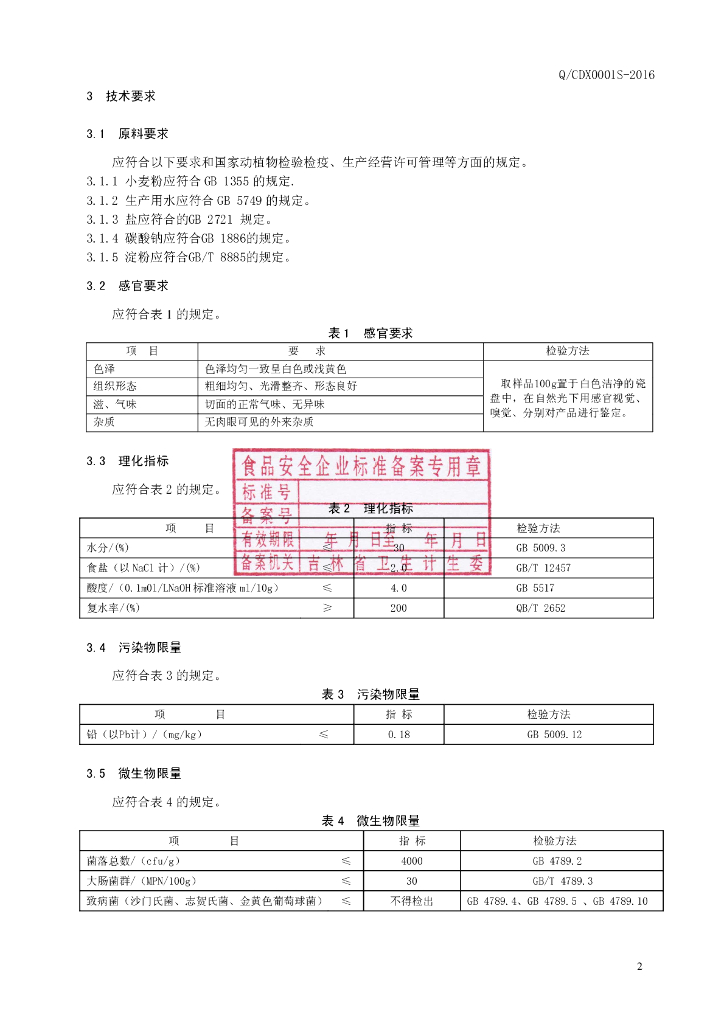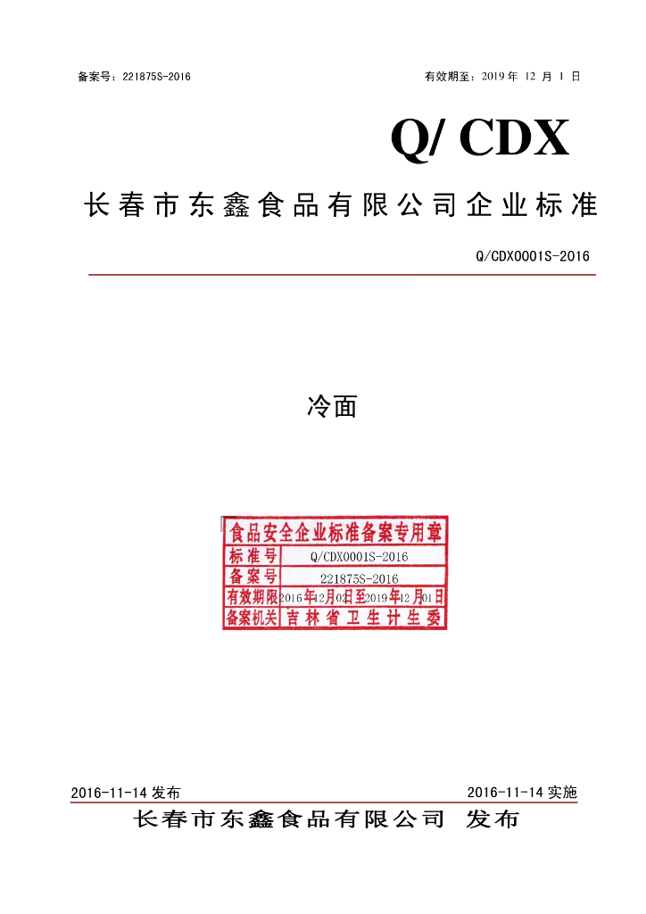 Q/CDX 0001S-2016 长春市东鑫食品有限公司 冷面