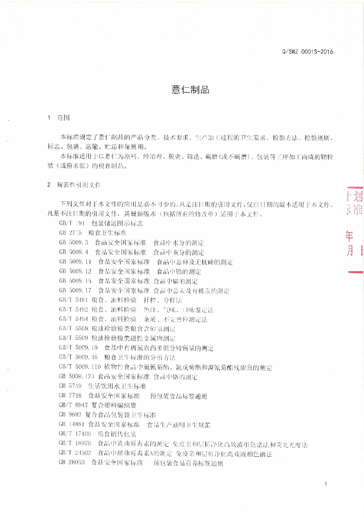 Q/SWZ 0001S-2016 师宗旺哲种植专业合作社企业标准 薏仁制品
