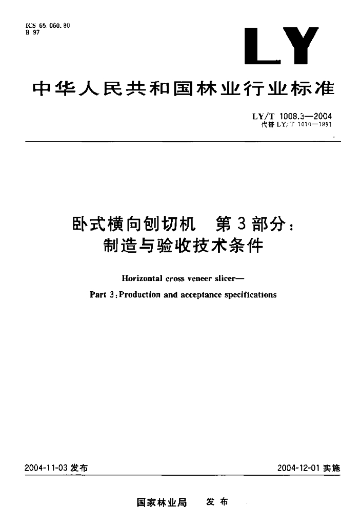 LY/T 1008.3-2004 卧式横向刨切机 第3部分 制造与验收技术条件